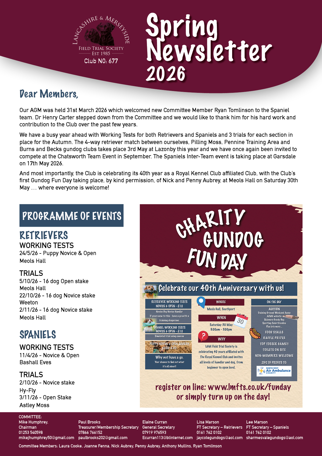 "On the 24th April 1985, a group of like minded people met to discuss the idea of forming a gundog club to fill what they saw as a gap in West Lancashire, with the view to providing training and eventually field trials. From this informal discussion, a club was formed of just 15 members. One year later, that number had grown to 106 and an application had been submitted to the Kennel Club to be registered - in 1986 the Lancashire & Merseyside Field Trial Society became affiliated.